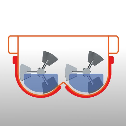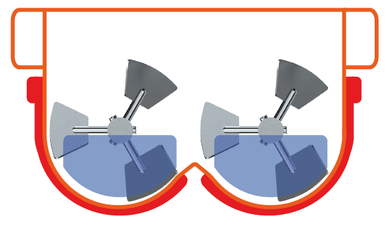 Le mélange est assuré par deux agitateurs à pales chevauchantes, positionnés à des hauteurs différentes et tournant en sens inverse à vitesse identique, garantissant un mélange homogène et efficace.
