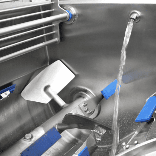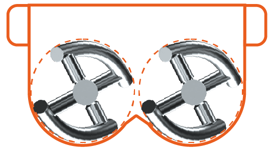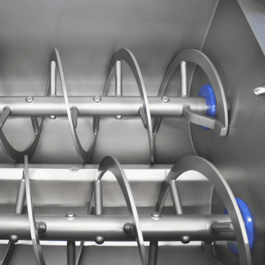 Le mélange est assuré par deux arbres divergents à pales ou à spirales, positionnés à la même hauteur, avec réglage indépendant de la vitesse et du sens de rotation. Un système de racleurs optionnel empêche les brûlures pendant le processus de cuisson.